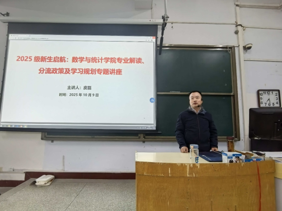 为助力2025 级新生明晰专业方向、熟悉学院资源、规划大学学业,10 月 9 日晚,数学与统计学院在 A01-119 教室举办 “2025 新生启航:专业解读、分流政策及学习规划” 专题入学教育讲座。本次活动由学院副院长皮磊主讲,2025 级全体新生参会。
