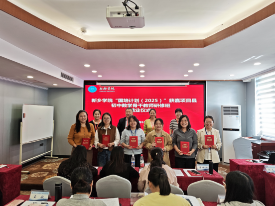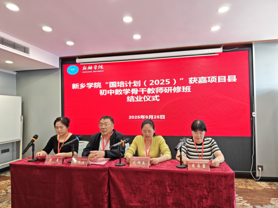 9月25日下午,由我校中小学教师校长研修院承办、数学与统计学院组织实施的“国培计划(2025)”获嘉项目县县级骨干教师能力提升培训研修班(初中数学)在九州宾馆举行了结班仪式。新乡学院数学与统计学院党委书记毛群英、院长张之正、项目工作组全体成员以及研修班的50名参训教师参加了结班仪式。结班仪式由研修班生活班主任窦曼主持。