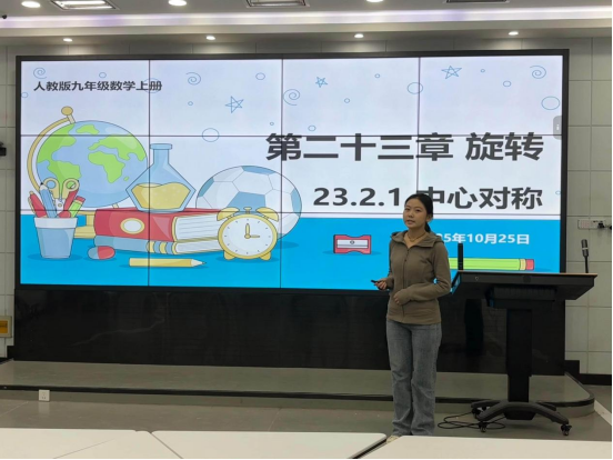 在教学过程中,贺怡涵同学通过经典例题拆解,示范如何利用中心对称性质简化图形、缩短解题路径,将精准的教学目标、精炼的环节设计与灵动的互动环节深度融合。她特别注重引导学生主动思考,通过分层提问鼓励大家大胆质疑,现场课堂氛围活跃;微型课结束后,她还主动分享教学设计思路,重点解析“短课时内如何突出教学重点、突破知识难点”的实操方法,为2023级同学提供了可复制的实践经验。