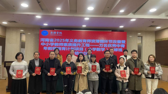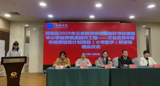 11月8日,我校中小学教师校长研修院承办、数学与统计学院具体实施的河南省2025年“义务教育师资薄弱环节改善暨中小学教师素质提升工程——万名优秀中青年教师培育项目”(小学数学)研修班,在新乡宾馆举行结业仪式。数学与统计学院党委书记毛群英、副院长皮磊,授课专家代表孟振苹,培训项目组全体成员及来自郑州、洛阳、三门峡的98名参训教师齐聚现场,仪式由班主任窦曼主持。