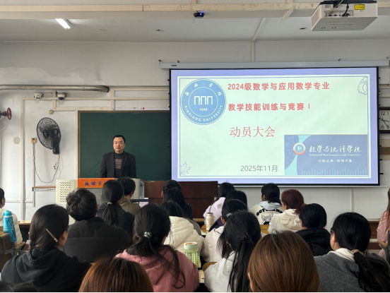 11月10日下午,为夯实2024级数学与应用数学专业学生教学实践能力,明确教学技能训练、竞赛及教育见习的目标与要求,数学与统计学院2024级数学与应用数学全体学生在A14-619教室参加了“教学技能训练与竞赛I”专业实训动员会。数学与统计学院副院长皮磊和数学与应用数学教研室主任张玲瑞老师出席动员大会,会议由翟英洁同学主持。