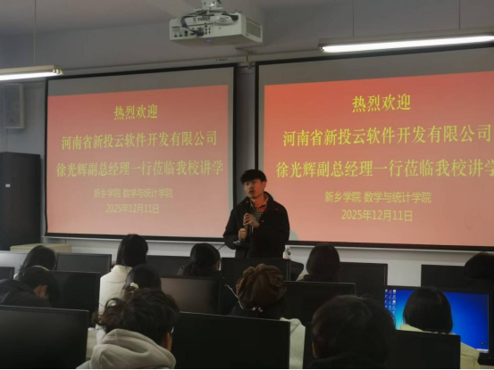 为帮助学生明晰专业价值、找准职业方向,搭建校企协同育人的坚实桥梁,12月11日下午,数学与统计学院特邀河南省新投云软件开发有限公司副总经理徐光辉、技术总监魏杨威等行业资深专家来校,为正在进行专业认知见习的2025级应用统计学专业学生开展专题讲座。本次讲座以“就业导向下的专业成长与核心能力构建”为主线,融合行业前沿动态、实战案例解析、职业路径规划等多重内容,给大一学子带来了一场兼具深度与温度的思想启迪,有效破解了新生在专业认知与未来发展上的迷茫。讲座由应用统计学教研室主任许寿方老师主持。