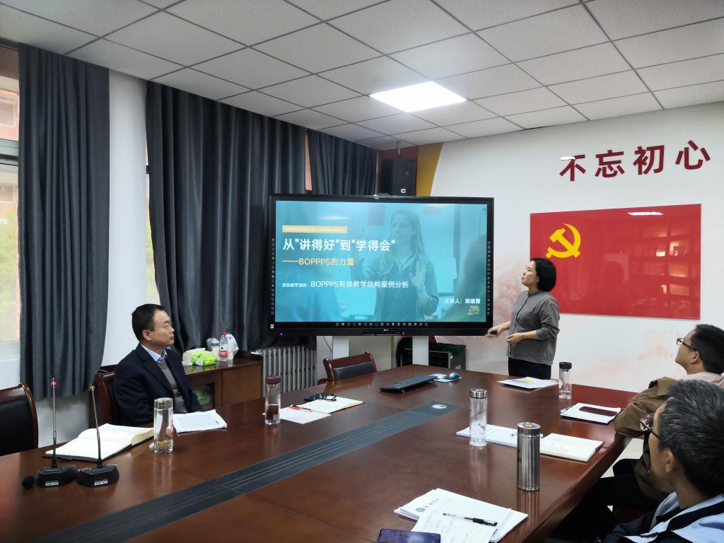 接着,郭建霞开展了时长10分钟的微型教学演练与参训感悟专题分享。她现场进行了10分钟标准BOPPPS模式微型教学展示,完整呈现了BOPPPS六大模块在课堂教学中的全流程应用,直观展现了该教学模式的实操效果。