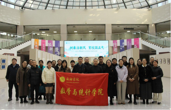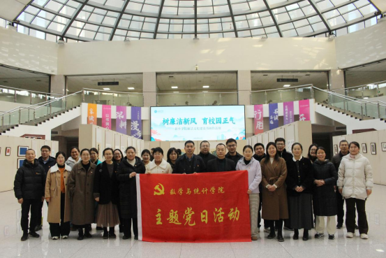 学院副书记兼纪委书记王仁举发言时强调,此次活动既是一次廉政文化的沉浸式学习,也是一次党性修养的生动实践。他希望全体党员教师以此次活动为契机,将廉洁教育融入教学、科研与学生工作中,以“廉洁从教、廉洁修身”的实际行动,为学院发展注入清风正气。 参观结束,学院老师在展厅内合影留念,鲜红的“数学与统计学院主题党日活动”旗帜与作品中的“廉洁”元素交相辉映,更加突出了活动的鲜明主题。