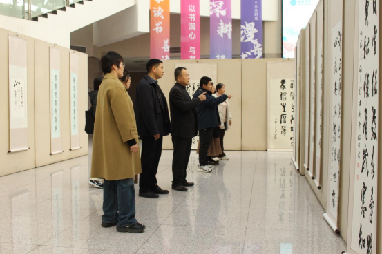 活动当日,图书馆穹顶大厅内墨香四溢,百余幅廉洁主题书画作品错落陈列,涵盖楷书、行书、国画、漫画等多种艺术形式。这些作品或笔力遒劲书写“清风两袖朝天去,不带江南一寸棉”的古训,或以细腻笔触绘就“荷莲出淤泥而不染”的意象,或以生动画作诠释“公私分明、克己奉公”的时代内涵。参观过程中,教师们驻足于每一幅作品前,仔细品读作品背后的廉洁寓意—从“以书明志”的书法作品里感悟先贤的清廉风骨,从“莲韵清心”的绘画作品中领会洁身自好的精神内核,不时相互交流心得,在艺术审美与思想共鸣中深化对“廉洁”二字的理解。老师们表示,以往对廉政的认知多停留在理论层面,而这些作品以生动的艺术形式让廉洁理念变得更具体、更可感。