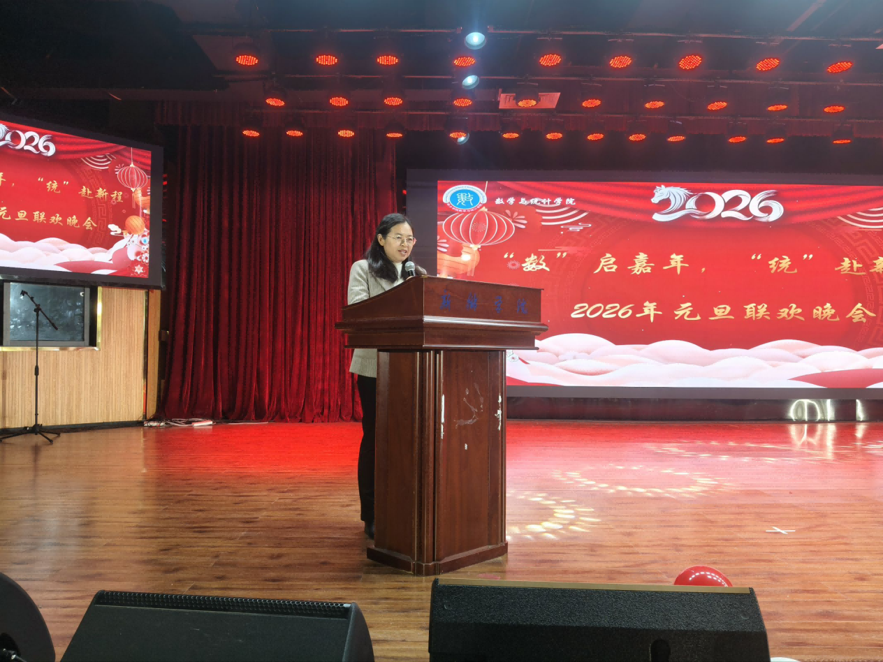 金蛇辞旧岁,骏马迎新春。为欢庆节日,凝聚情谊,展现师生风采,12月22日,数学与统计学院在行政楼一楼文化艺术中心隆重举办“数启嘉年・统赴新程”2026年元旦晚会。新乡学院副校长赵伟杰、数学与统计学院党政班子和师生欢聚一堂,共享这辞旧迎新的视听盛宴。